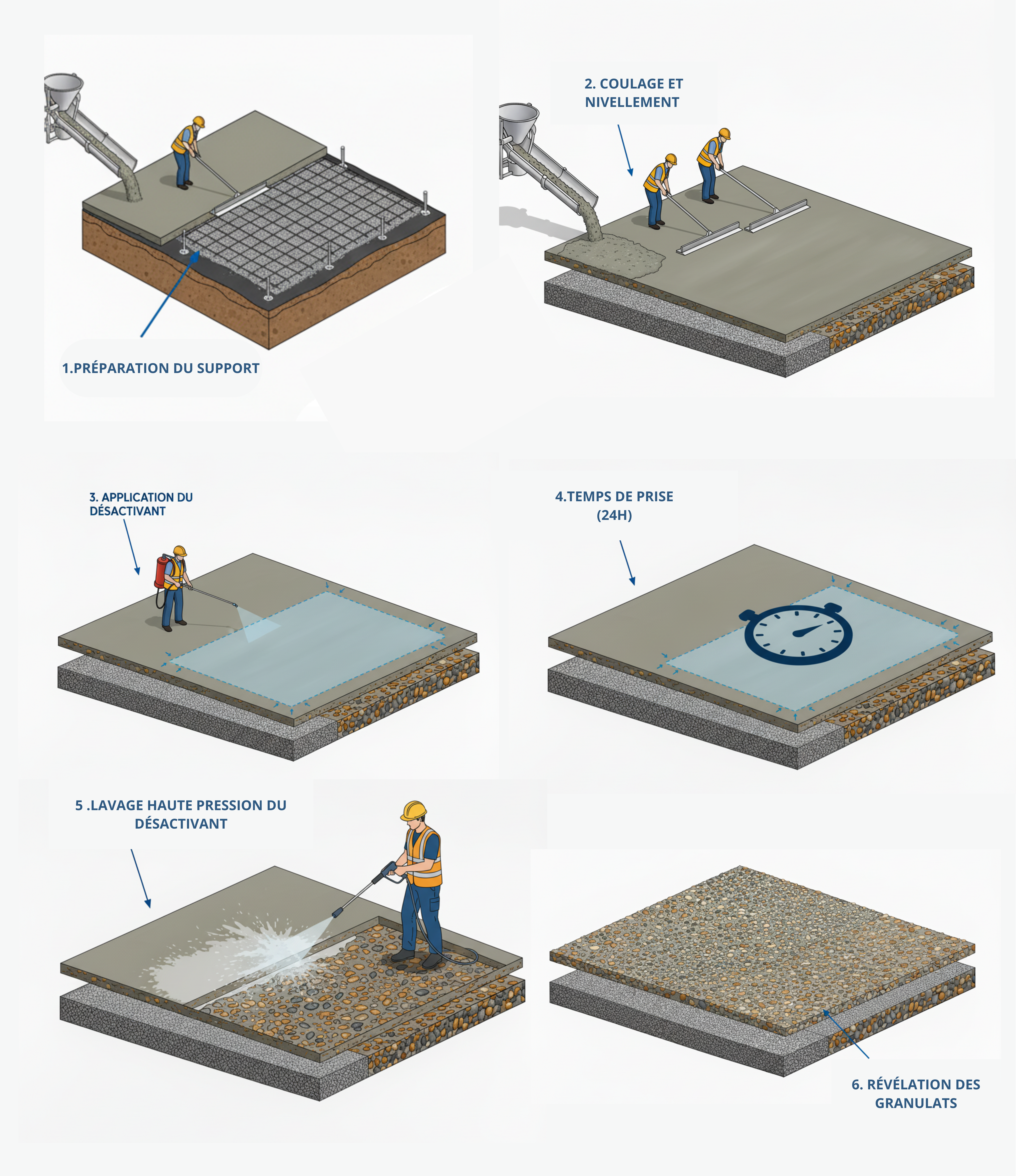 👉 Astuce pro : ajouter des fibres synthétiques dans le béton améliore sa cohésion et facilite l’effet du désactivant plus tard.