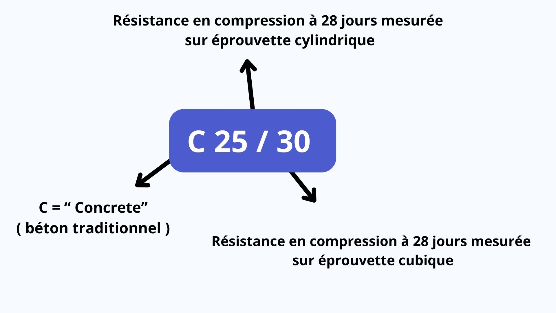 La classe de résistance du béton à 28 jours est notée par la lettre C (pour "Concrete"), suivie de deux valeurs représentant la résistance mesurée sur éprouvettes cylindriques et cubiques (exemple : C25/30, C30/37).