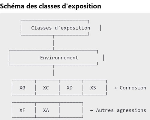 | Aucune agression | X0 | Aucune exposition à la corrosion ni aux attaques chimiques |